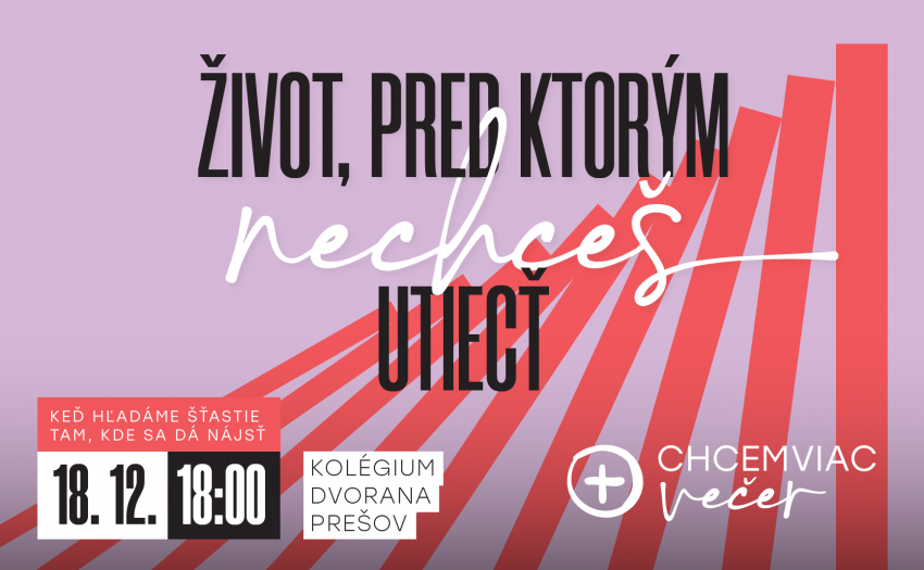 Pozývame Vás na ďalší CHCEMVIAC VEČER "Život pred, ktorým nechceš utiecť", ktorý sa uskutoční v online priestore v sobotu, dňa 18.12.2021 o 18:00 hod.. Téma večera: Keď hľadáme šťastie tam, kde sa dá nájsť. Tešia sa na Vás: Slavomír Slávik, Peter Michalčík, Andrej Velebír, Dávid Motýľ, Vlado Gál, Stano Kupský, Šimon Brehuv, Ivana ”Bizi” Argayová, Alexandra Motýľová, Táňa Velebírova a ďalší…