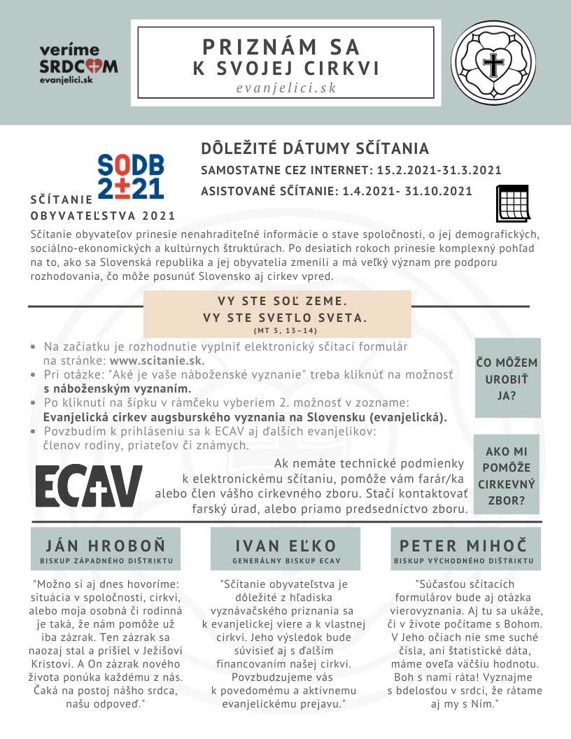 Dňom 15.2.2021 (pondelok) začalo povinné sčítanie obyvateľstva 2021 (SODB 2021), ktoré potrvá do 31.10.2021 (15.2. - 31.3.2021 elektronicky a 1.4. - 31.10.2021 asistovaným sčítaním). SODB je dôležité vzhľadom na komplexnejší pohľad na to ako sa Slovenská republika a jej obyvatelia za desať rokov zmenili a má veľký význam aj pre podporu rozhodovania, čo môže posunúť Slovensko vpred. Pre veriaceho človeka sčítanie ponúka možnosť vyjadrenia svojej viery formou priznania sa k náboženstvu, ku ktorému vnímam svoju prináležitosť. Pre nás evanjelikov, kresťanov, môže byť i veľmi dôležitým vyjadrením ku Komu patríme, a to tu časne i večne. Preto dovoľte nám podporiť a povzbudiť Vás k priznaniu sa k svojmu Spasiteľovi - Ježišovi Kristovi i vyplnením náboženského vyznania, vzťahu, príslušnosti k cirkvi - Evanjelická cirkev augsburského vyznania na Slovensku (evanjelické), v zmysle biblických slov "Preto, ktokoľvek ma vyzná pred ľuďmi, toho vyznám aj Ja pred svojím Otcom, ktorý je v nebesiach" (Evanjelium podľa Matúša 10,32).