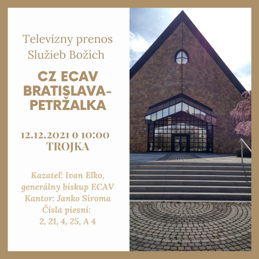 Prijmite pozvanie na bohoslužby v 3. adventnú nedeľu, ktoré budú vysielané 12.12.2021 o 10:00 hod. na RTVS3 z Cirkevného zboru ECAV na Slovensku Petržalka.